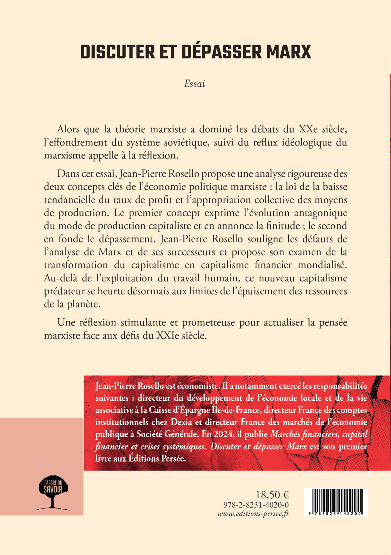 Dans cet essai, Jean-Pierre Rosello propose une analyse rigoureuse des deux concepts clés de l’économie politique marxiste : la loi de la baisse tendancielle du taux de profit et l’appropriation collective des moyens de production. Le premier concept exprime l’évolution antagonique du mode de production capitaliste et en annonce la finitude ; le second en fonde le dépassement. Jean-Pierre Rosello souligne les défauts de l’analyse de Marx et de ses successeurs et propose son examen de la transformation du capitalisme en capitalisme financier mondialisé. Au-delà de l’exploitation du travail humain, ce nouveau capitalisme prédateur se heurte désormais aux limites de l’épuisement des ressources de la planète.