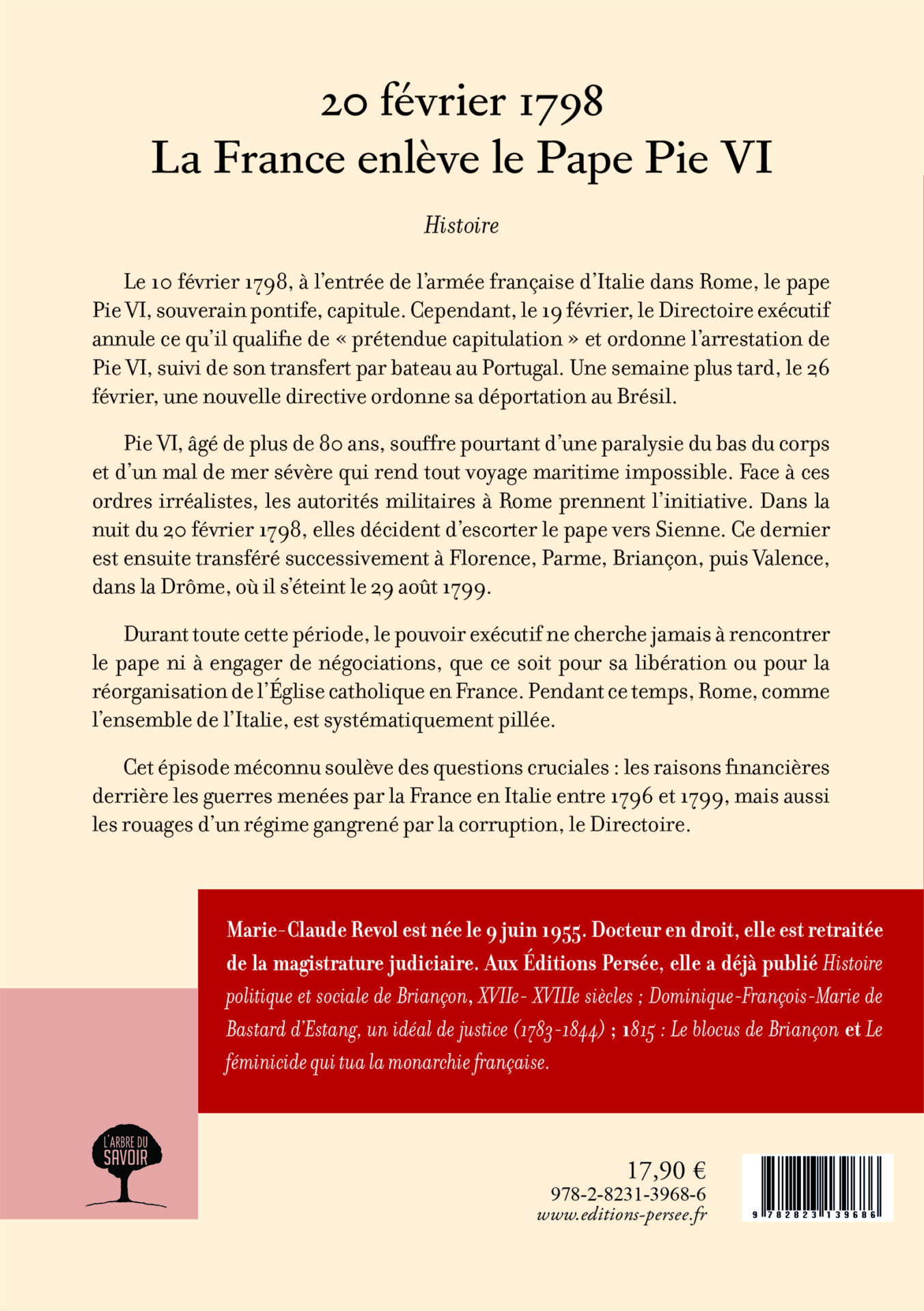 Le 10 février 1798, à l’entrée de l’armée française d’Italie dans Rome, le pape Pie VI, souverain pontife, capitule. Cependant, le 19 février, le Directoire exécutif annule ce qu’il qualifie de « prétendue capitulation » et ordonne l’arrestation de Pie VI, suivi de son transfert par bateau au Portugal. Une semaine plus tard, le 26 février, une nouvelle directive ordonne sa déportation au Brésil.